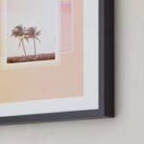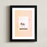 This art photography print features a black and white photo of palm trees on a background of peach and pink .
