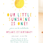 A sweet and colorful first birthday card featuring one photo of your little sunshine.