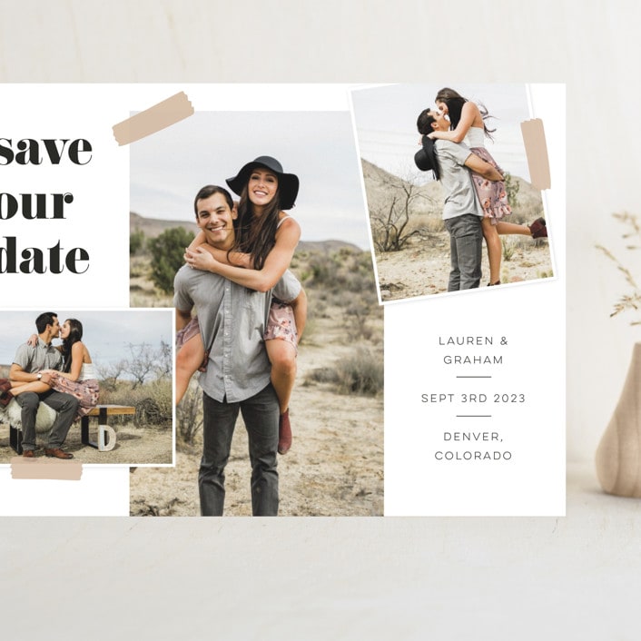 A modern save the date card inspired by a moodboard. This design has space to showcase 3 photos.