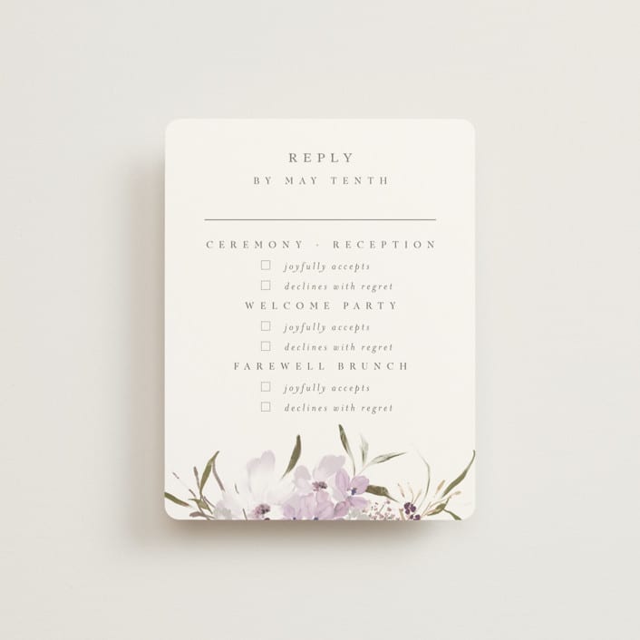 Beautifully request that your guests RSVP to multiple events for your wedding celebration. Designed to coordinate with your wedding invitation suite, these RSVP cards are a perfect accompaniment to your Minted wedding invitation. Tie it all together with a coordinating belly band for a luxe finishing touch. Each insert card is fully customizable and printed on luxe paper.