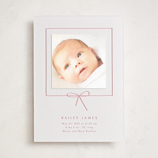 A masterful blend of our two most premium formats, photo mount letterpress announcements add a handcrafted, elevated touch to the news of baby’s arrival. First, the designs are hand-pressed into thick, soft paper, creating an artfully tactile impression. Then, the baby’s photos are individually printed on semi-gloss photo paper—promising our best photo quality—and mounted to the letterpress cards, meaning every card in your order will arrive ready to send. This format is available on our Premium 100% Cotton and 100% Cotton paper.