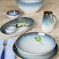 Cypress Grove adds a dramatic look to your home with the beauty of reactive glazes with stunning blues, browns and whites. The oval platter makes a statement as serving tray or display art. 14" long x 8 1/2" wide. Durable stoneware is microwave and dishwasher safe. Made in Portugal.